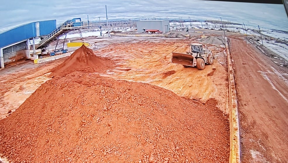 Heavy-duty loader moving refinery sludge pile at aluminium plant