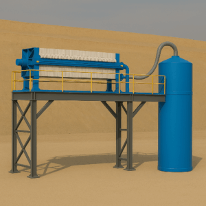 Au fil des ans, on a vu des cas où le tank de filtrat était installé à un niveau incorrect, souvent égal ou même supérieur à celui du filtre-presse, comme le montre l’image volontairement « erronée » générée par l’intelligence artificielle.